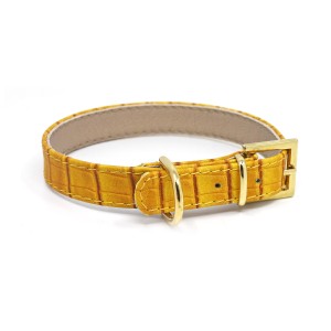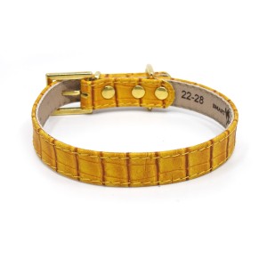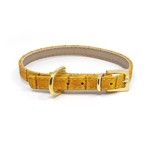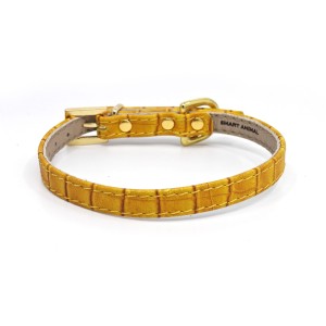 Stylish, leather collar with yellow crocodile pattern and golden buckle. This collar will be a beautiful decoration on the neck of a Chihuahua, Dachshund, Jack Russell Terrier, Poodle or Pug. Compatible with a leash from the same series. It also looks beautiful with a black leather city leash.